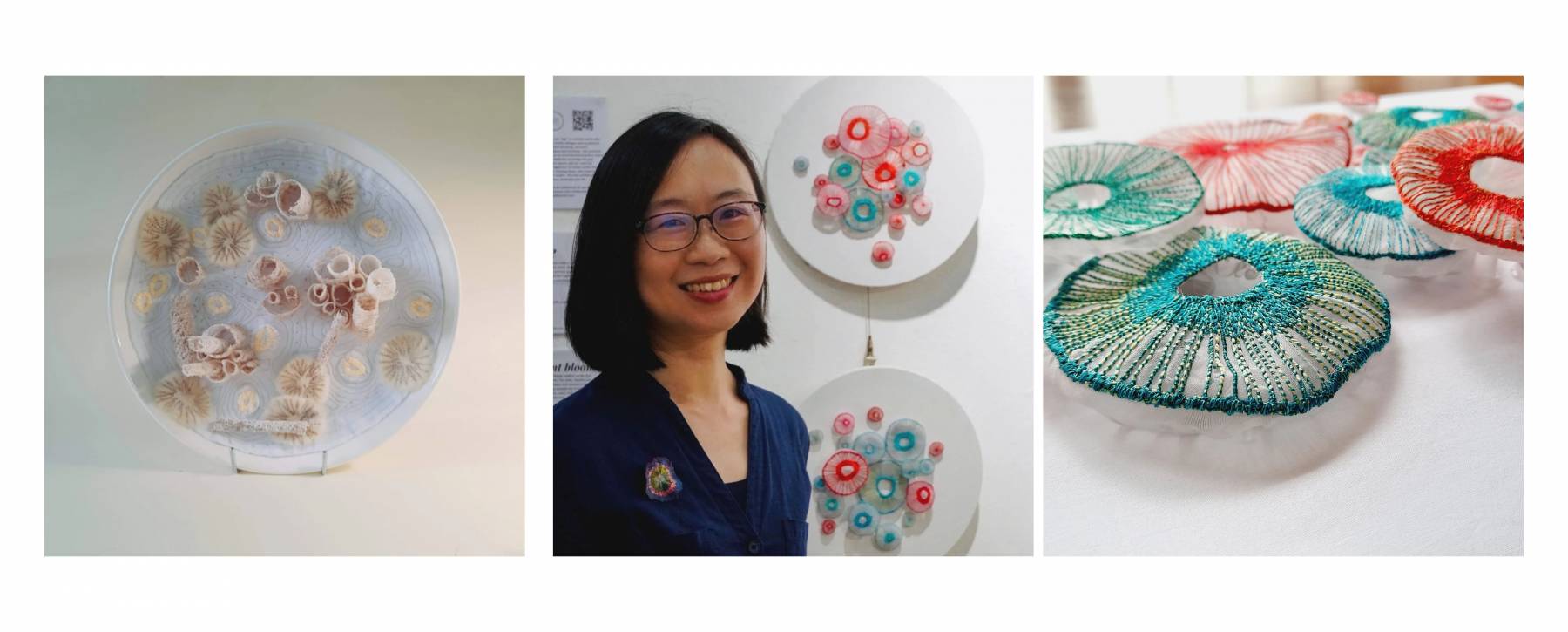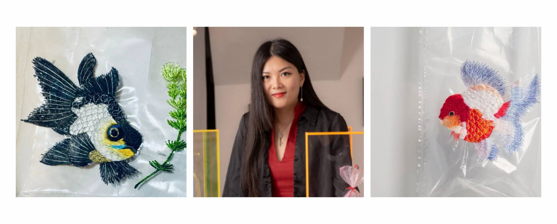 Angel Hui reimagines the role of single-use plastic through her Goldfish series, inspired by the bags used in Hong Kong’s Goldfish Market. Collaborating with Suzhou embroiderers, she hand-embroidered goldfish onto transparent plastic bags, blending traditional craftsmanship with contemporary art and inviting reflection on the social meaning of everyday objects.